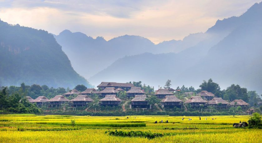 After breakfast and check out hotel, our local guide and driver meet at hotel and we start to travel northwest to the rural, indigenous villages of Mai Chau valley. Enjoy 4 hour scenic hilly road in the north Vietnam. We will have some stops for photography and coffee. Upon arrival, you’ll visit a local homestay and enjoy a delicious lunch prepared using fresh, local farm produce. After familiarising yourself with the surroundings, your guide will take you on a leisurely bike ride through the lush green countryside. Our cycling tour will go through villages, rice paddies, rivers and meet local families. See local Thai ethnic tribes working with buffalo in the fields, wander past thriving vegetable gardens and terraced rice paddies before heading to your Eco-lodge. Enjoy the rest of the day at your leisure – relax with a book or take in the beauty of this unique area.